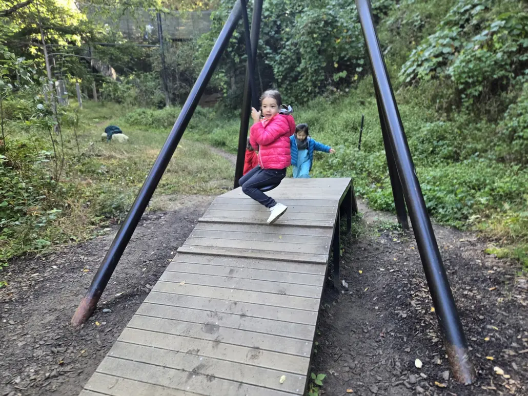 Unser Ausflug zum Waldspielplatz in Suwon war richtig aufregend! Schon im Bus waren wir ganz gespannt und haben viel geredet und gelacht. Als wir angekommen sind, haben wir zuerst gefrühstückt, damit wir genug Energie zum Spielen hatten. Danach durften wir endlich den ganzen Waldspielplatz erkunden. Am coolsten fanden wir die lange Röhrenrutsche, die weit den Hang hinunterging. Wir sind immer wieder nach oben gelaufen, nur um noch einmal hinunterzurutschen. Besonders spannend waren auch die hohen Hängebrücken und die Netztunnel. Dort musste man gut balancieren können, denn die Holzstufen und runden Trittscheiben hingen in Seilen und wackelten ein bisschen. Wenn man alles geschafft hatte, kam man zu einem großen Aussichtshaus in der Luft, das aussah wie eine runde Baumhaus-Kugel. Von dort oben konnte man super über den Wald schauen. Es gab auch eine Seilbahn, bei der wir mit viel Schwung über eine Lichtung gefahren sind, und überall im Wald versteckte kleine Kletter- und Entdeckungsgeräte, wie eine Hängematte aus Seilen und Baumstämme zum Balancieren.